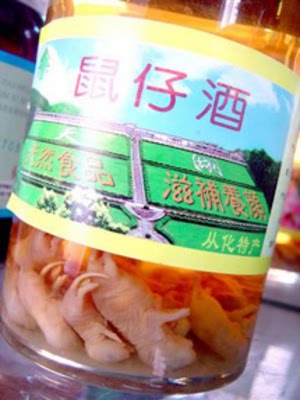 Parece horrible, asqueroso y demás, pero los chinos han sabido obtener los mejores beneficios de cada cosa que hacen, por ejemplo este es un tónico revitalizante que consiste en poner pequeñas ratitas dentro de una botella, llenar la botella con vino de arroz y dejarla fermentar. Nosotros pasamos.